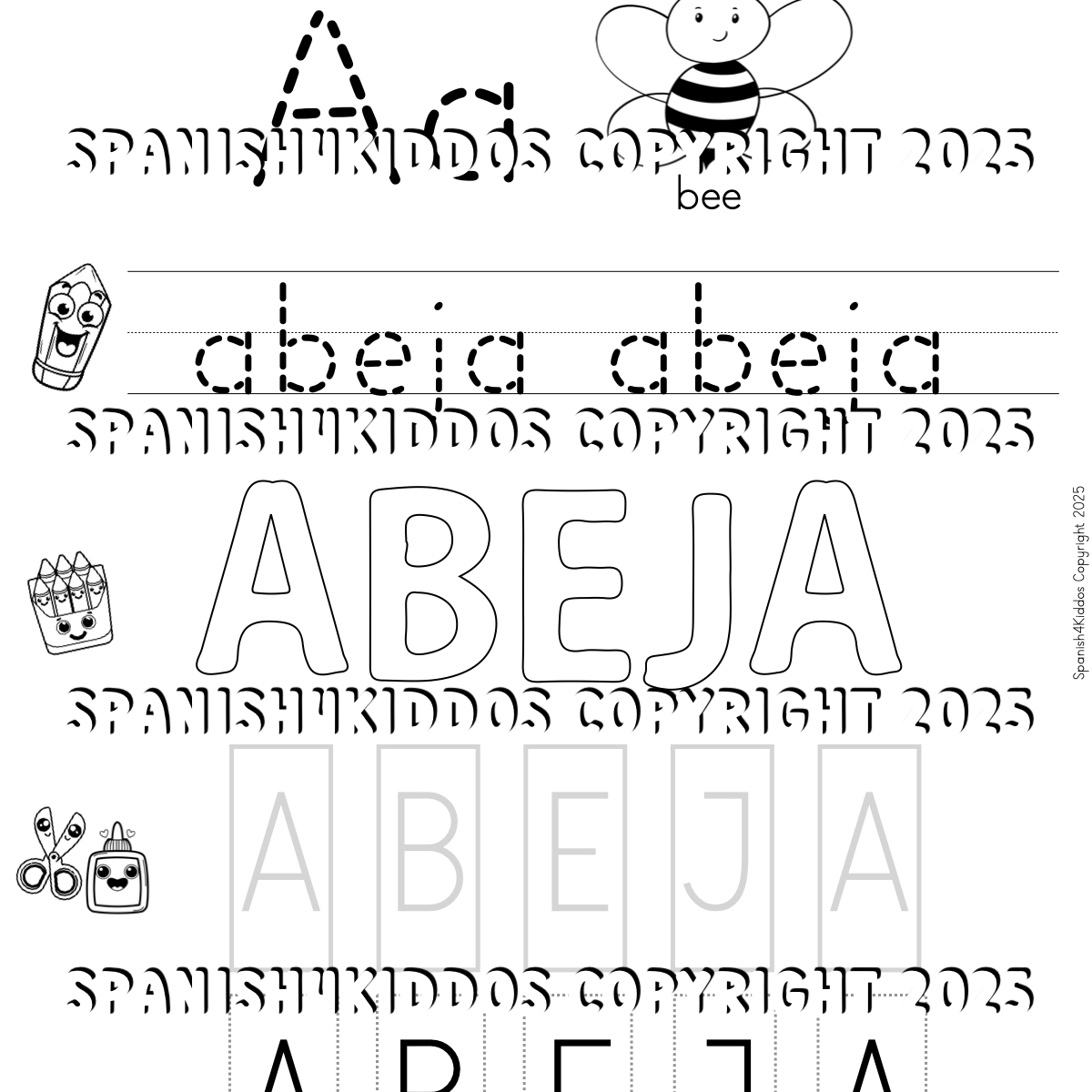 - Spanish Words Activities Set: In this black and white set, young learners practice the Spanish letters by using three activities – writing, coloring, and cut and pasting. 27 pages.